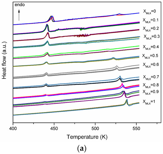 The DSC curves obtained for meloxicam, tartaric acid and binary mixtures with different mole fractions, obtained from the solvent-assisted mechanosynthesis, are shown in Figure 2a. The DSC curve of L-tartaric acid has two endothermic peaks at 447.7 K corresponding to the melting process and at 527.7 K corresponding to the decomposition process. In the case of meloxicam, the DSC curve has one endothermic peak at 538.2 K attributed to the melting process.