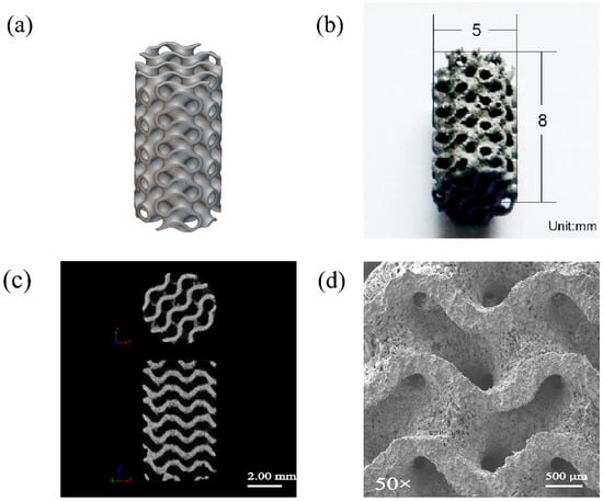 Morphology of the porous Zn-1Mg-0.1Sr alloy scaffold: (a) gyroid model; (b) microscopic morphology; (c) micro-CT image; and (d) SEM image.