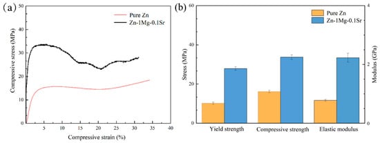 Compression tests: (a) stress–strain curves of porous Zn-1Mg-0.1Sr and pure Zn alloy scaffolds; (b) compressive strength of porous Zn-1Mg-0.1Sr and pure Zn alloy scaffolds.