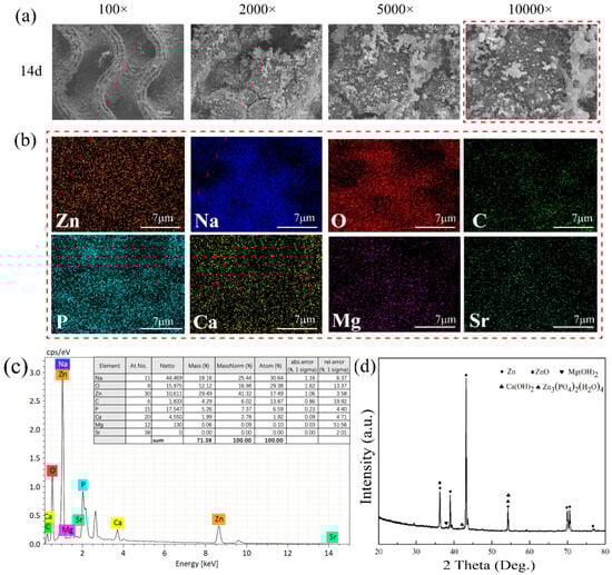 EDS analysis of the corrosion degradation products revealed a composition primarily of Zn, O, Na, P, Ca, C, Mg, and Sr after immersion for 14 d. Zn was the most dominant element, with Mg and Sr less abundant from 1 d to 14 d (Figure 4b,c). XRD analysis showed that the degradation products mainly consisted of Zn, ZnO, Ca(OH)2, Mg(OH)2, and phosphate Zn3(PO4)2(H2O)4. As the immersion time increased, the insoluble Ca-P and Zn degradation products gradually increased, covering the alloy scaffold’s surface (Figure 4d).