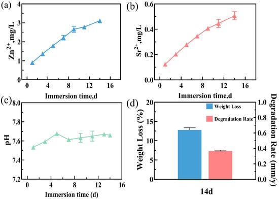 Since Mg2+ was already present in the SBF, this study only measured the concentration changes in Zn2+ and Sr2+ released from the corrosion degradation. The results showed that the release rate of Zn2+ was rapid during 1 d to 14 d, with an average concentration of 2.14 ± 0.82 mg/L. The release rate of Sr2+ increased steadily, with an average concentration of 0.34 ± 0.14 mg/L. The release amount of Zn2+ was significantly higher than that of Sr2+ (Figure 5a,b).