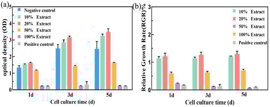 Optical density (OD) and relative growth rate (RGR%) of MC3T3-E1 cells in each experimental group: (a) optical density (OD); (b) relative growth rate (RGR%).