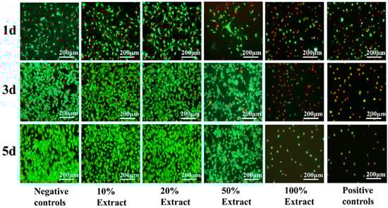 Live/dead fluorescence staining of MC3T3-E1 cells exposed to different concentrations of extracts and for different culture periods.