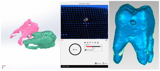 The 3DSYSTEMS CAPTURE 3D scanner and Geomagic for SolidWorks software (both components produced in the USA) were used to obtain a primary geometry of the molar. Some of the specific 3D scanning operations are shown in Figure 1. Scan alignment techniques were used.