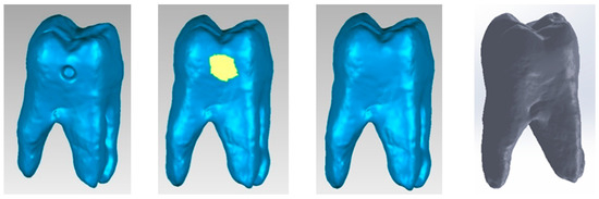 It was also necessary to obtain the integral molar model. For this, reverse engineering techniques were used in the Geomagic software. Thus, the cavity model was subjected to elimination and then filling operations with tangent surfaces. The final model was loaded into SolidWorks and transformed into a virtual solid. These transformations are shown in Figure 2.