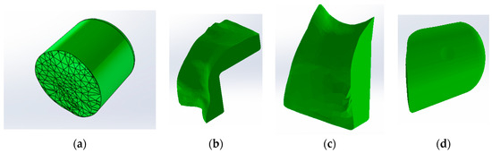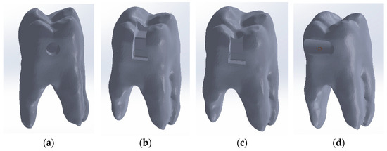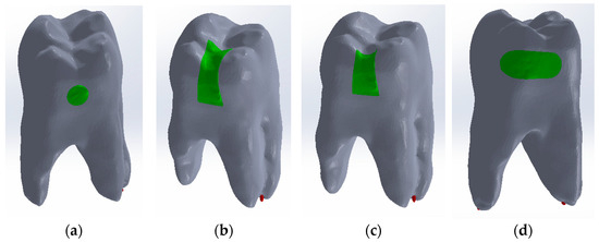 (a) Composite-filling model in direct access cavity situation; (b) model of composite filling for the occlusal–distal cavity; (c) model of the composite layer for the vertical slot cavity; (d) composite layer model for the horizontal slot cavity.