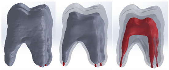 To determine the geometry of molar dentin, full or partial offset techniques were applied to the whole tooth model. Similarly, to obtain the pulp model, offset techniques were applied successively to the whole model or to selections of it.