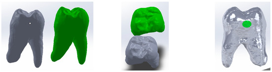 In order to obtain the composite filling model for the direct access cavity, the outer models of the intact molar and the direct access cavity molar were loaded into SolidWorks, as shown in Figure 5 (the outer model of the intact molar is coloured green).