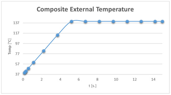 An important issue that arises when defining a simulation of this type is given by the amount of specific intraoral thermal convection. Thus, Haiwei X. and collaborators, in 2017, determined the convection phenomenon, using experimental and virtual techniques, as having values ranging from 2 W/m2 × K to 3 W/m2 × K [29]. In these simulations, it was considered to be 3 W/m2 × K. Also, analysing the friction phenomenon that exists between the finishing and polishing tools and the composite, we proposed a thermal protocol for the outer surfaces of the cavity-restoration layer [19,22]. Thus, it was considered that the temperature of these surfaces increases from 37 °C to 140 °C in 5 s and then remains at 140 °C for another 10 s. In total, the thermal process analysed took 15 s and is described by the diagram in Figure 8.