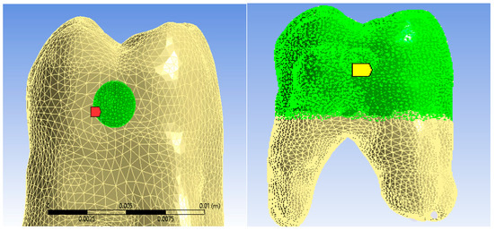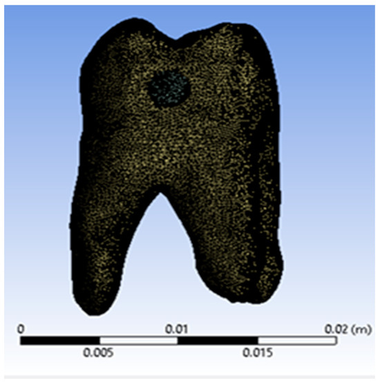 The molar model to which the occlusal–distal cavity restoration was applied was imported into Ansys Workbench. The Transient Thermal module was chosen, which can simulate transient thermal situations.