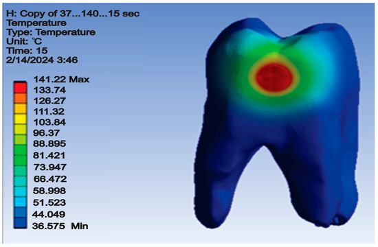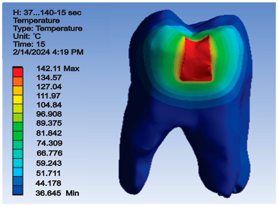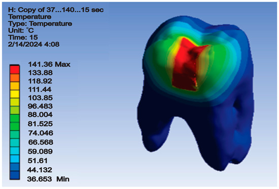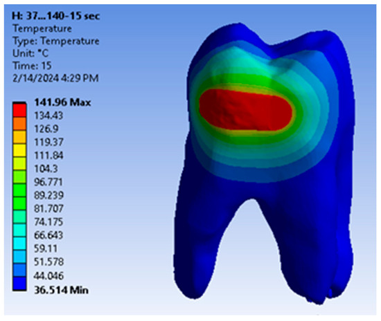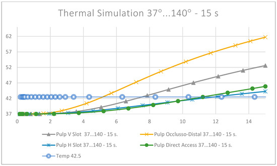 Regarding the maximum temperature recorded after the 15 s of simulation, for the four situations it was found that the influence of the volume of the obturation on the transmission of heat to the pulp was no longer so obvious. Although, in the case of the occluso–distal obturation, the highest intrapulpal temperature was recorded (61.74 °C), and between the direct access and horizontal slot obturations, the values were similar (45.89 °C and 44.28 °C, respectively). An intermediate value was obtained for the vertical slot obturation (52.6 °C). This could be explained by the ability of dental hard tissues to disperse heat when the irritating factor acts for a longer period of time.