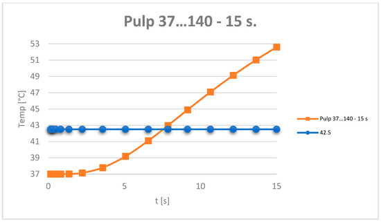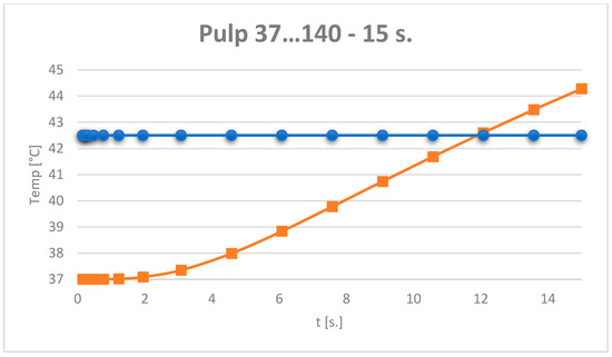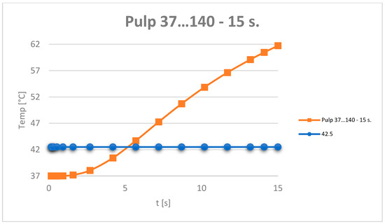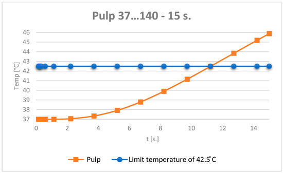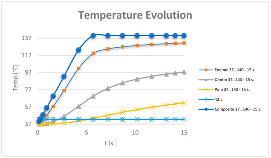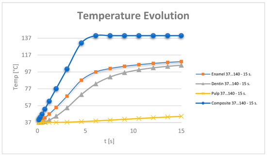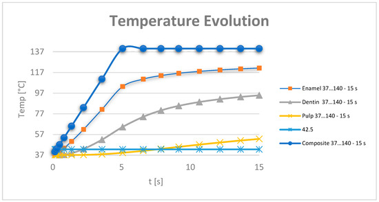 The temperature evolution in the dental pulp was also monitored (Figure 12).