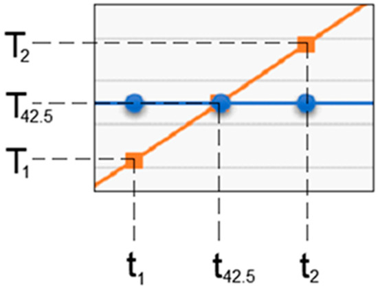 Approximating the curve with a straight line. Temperature evolution in the dental pulp (coloured in orange) and limit temperature of 42.5 °C (coloured in blue).