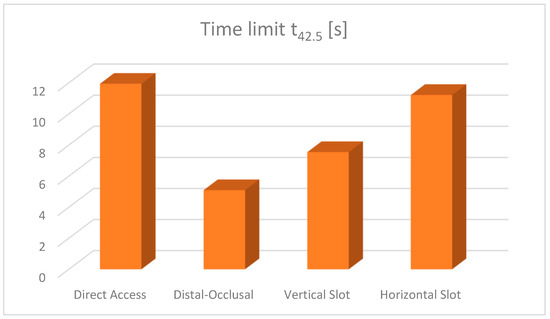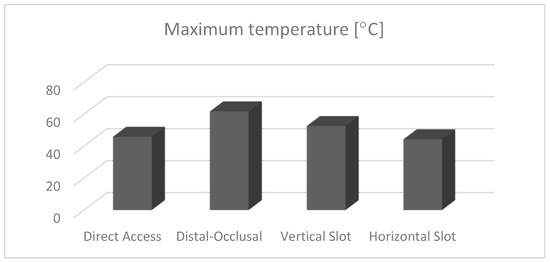 Analysing the diagram of the time limits at which the dental pulp reaches the critical temperature of 42.5 °C, it can be seen that the shortest time limit occurs in occlusal–distal restorations and the longest in direct access restorations.