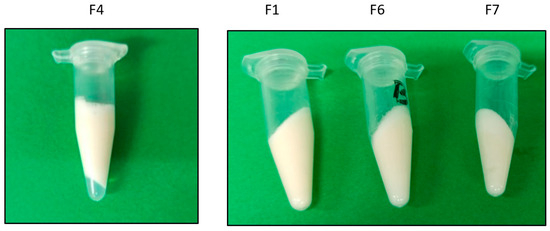 Representative images of results of centrifugation assays (3500 rpm/30 min) in different formulations (F4, showing phase separation; F1, F6, and F7, showing stability).
