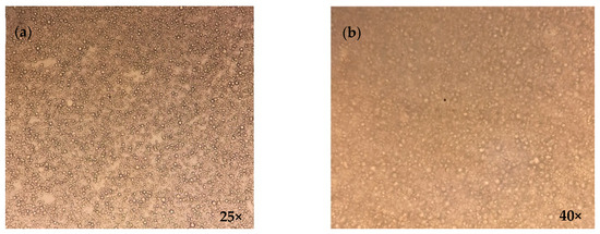 The different formulations were observed under the visual microscope at zero time as well as after the cycle tests. In addition, the formulation that showed the best results (F7) was also observed at one and two months (long term). Homogeneity and the absence of aggregates were verified. A representative image is shown in Figure 3.