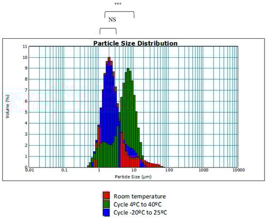 As seen in Figure 4, with increasing temperature, the droplets undergo a slight increase in size as the size dispersion curve of the 4 °C to 40 °C cycle has shifted slightly to the right. This may be due to the fact that the affinity of surfactants varies with temperature, resulting in some degree of aggregation of smaller droplets. Although there is statistical significance between the 4 °C to 40 °C cycle curve and the rest of the results, these differences have no practical repercussion and will not influence the quality of the cosmetic cream to be developed, since the range of measurements is still between 0.2–12 μm, as in the case of room temperature and the −20–25 °C cycle.