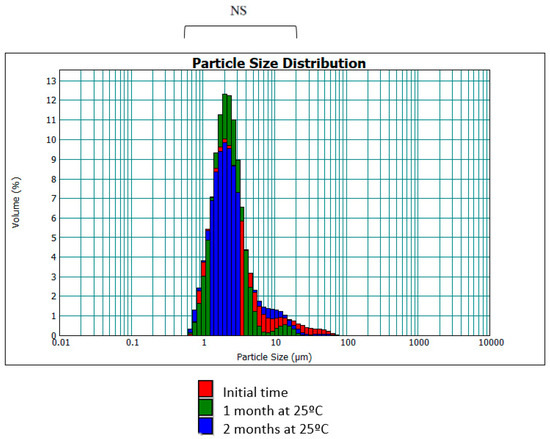 Distribution of droplet size (d[4,3]) as a function of time (NS: no significant differences).