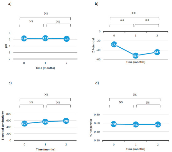 Results of (a) pH, (b) Z—potential, (c) conductivity, and (d) percent of hesperetin with respect to the time (NS: no significant differences; **: p < 0.01).
