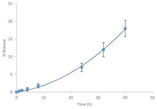 The percentages of hesperetin released as a function of time from the formulation assayed are expressed in Figure 8. In total, 10% of the active ingredient was released after 24 h for a semi-solid vehicle and approximately 20% was released after 48 h.