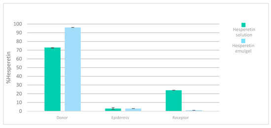 The accumulative hesperetin amounts (%) obtained from the different formulations in the donor chamber, epidermis skin, and receptor chamber are shown in Figure 9. As can be seen, the solution provided the greatest penetration rate of hesperetin in the receptor compartment at 24 h compared to that of the hesperetin emulgel. This fact could be attributed to the formulation characteristics, like the higher oil content and viscosity [37], which are in accordance with the zero-order release kinetics previously observed with the emulgel (see Figure 8).