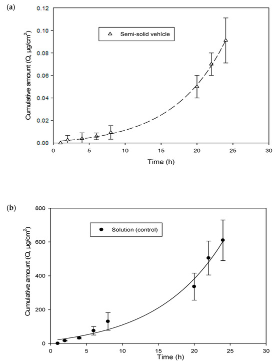 Cumulative amount of hesperetin across human skin. (a) Semi-Solid Vehicle. (b) Solution (Control).