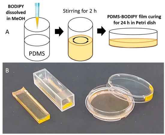 BODIPY-doped PDMS films fabrication process (A); and photo (B).
