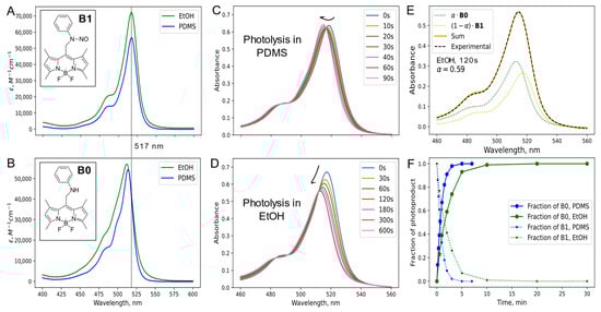 (A,B) absorption spectra in EtOH and PDMS of B1 and B0, respectively; (C,D) changes in the absorption spectra of B1 during photolysis; (E) example of the decomposition of absorption spectra to the spectra of the initial and final products (photolysis in EtOH for 2 min); and (F) kinetics of the transition from initial to final product in EtOH and PDMS.