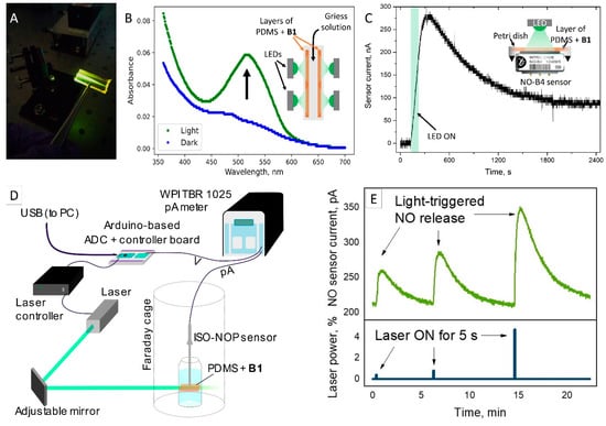 (A) Photo of the laser beam passing through B1-doped PDMS film; (B) Griess assay showing the increase in nitrite concentration in a sample after irradiation of PDMS films by green light; (C) dynamics of gas-phase NO release from PDMS film monitored with selective NO-B4 sensor; (D) scheme of experimental setup for measuring laser-induced NO release into aqueous solution; and (E) prolonged light-induced, power-dependent release of NO into the aqueous solution monitored by an electrochemical sensor.