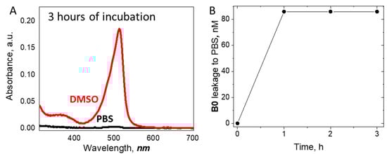 (A) Absorption spectra of cuvettes with DMSO (red line) and PBS (black line) after incubation of PDMS film doped with the dye B0; and (B) time dependance of the dye leaking into PBS.