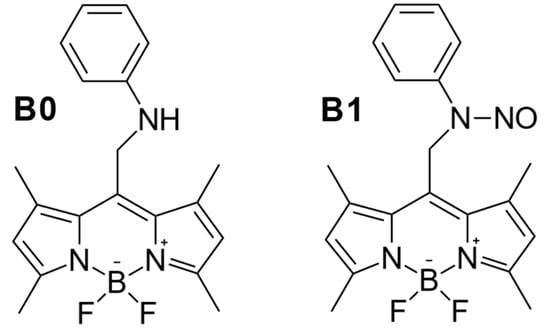 Photodynamically activated NO donor species, particularly those that may also generate ROS, are very attractive. Visible light absorption of these molecules is typically reached by conjugation of the NO-releasing moiety with chromophores such as rosamine and rhodamine [,,,,,,], or carbon nanodots []. The BODIPY (4,4-difluoro-4-bora-3a,4a-diaza-S-indacene) chromophore could be superior as an antenna due to its unique photochemical properties, such as its narrow absorption bands with tunable wavelengths, which provide successful usage of these dyes in various scientific fields, from optoelectronics to life sciences (see [] and references therein). The first BODIPY-based NO photodonor (NOBL-1) utilizing N-NO bond homolysis was reported by the Nakagawa group []. Extended work on BODIPY-based NO-releasing molecules was conducted by the Sortino group [,,]. Several NO photodonors based on BODIPY [] and aza-BODIPY [] cores were developed by our group as well.