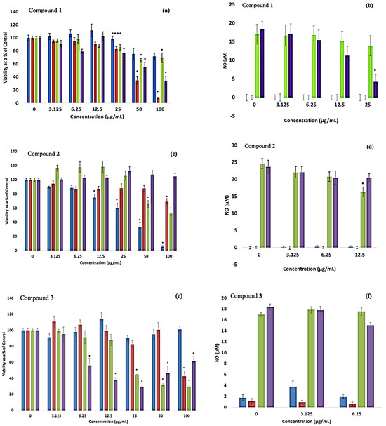 Inflammation is a host response to harmful stimuli and features traditional signs such as redness, swelling, heat, and pain. This study aimed to assess the activity of the crude extract, pure compounds, and their nanoparticles on NO production [29,30].