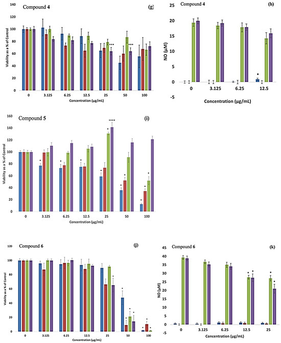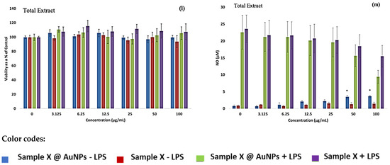 The assessment of RAW 264.7 cell viability and NO after 24 h exposure to various AuNPs, TE, and compounds in either the presence or absence of LPS. Cells were treated with the following: (a,b) compound 1; (c,d) compound 2; (e,f) compound 3; (g,h) compound 4; (i) compound 5; (j,k) compound 6; (l,m) TE. Data are presented as mean ± SEM, where the p-value indicates statistical significance against the relevant control, using one-way ANOVA. * p < 0.001, *** p = 0.003, and **** p = 0.005. Sample X + LPS and green should be Sample X + AuNPs + LPS.