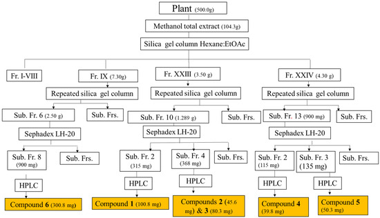 The main fraction IX (7.30 g) was chromatographed on silica gel using a gradient of hexane and EtOAc (80:20 to 0:100), and the sub-fraction 6 was purified on Sephadex and then semi-prep HPLC using a mixture of MeOH and DIW (1:1, isocratic) to give compound 6 (300.8 mg). The analysis of the total extract using LC-MS was carried out to profile and identify the compounds associated with nanoparticles when the total extract was used (Supplementary Material Figure S1).