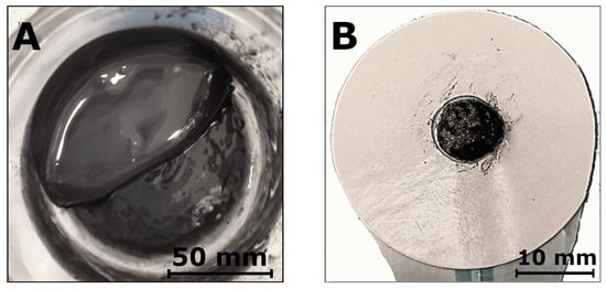First, homogenization studies were performed using CNT array suspensions in a common organic solvent, acetone. The suspensions were homogenized for 15 min, 30 min, 45 min, 60 min, 90 min, and 120 min at 40% (approx. 50 W), 60% (approx. 74 W), and 80% (approx. 99 W) of amplitude and power. Increasing the amplitude to 80% resulted in a significant increase in temperature and the overheating of the probe during operation despite the process being conducted in ice. The powders produced using 40% and 60% were used to manufacture screen-printing pastes. The pastes were based on 8% PMMA in D.B. Acetate (see also Materials and Methods) according to a previously developed procedure. Five paths of 15 mm length, 1 mm width, and approx. 10 µm thickness (one layer) were printed using each paste. The paths were thermally dried, and their resistance was measured. All pastes made from powders homogenized at 40% power were characterized by a much higher resistance than the 60% ones. The average resistance measured for 60% power amounted to 46 ± 17 kΩ for 15 min and 52 ± 17 kΩ for 30 min. For 40% power, resistance was 2650 ± 350 kΩ for 15 min and 629 ± 172 kΩ for 30 min (see also Table S1 in Supplementary Materials). The lowest resistance was obtained for CNTs homogenized at a 60% power amplitude for 15 min. These nanotubes were used to produce the first hybrid hydrogels. The hybrid hydrogels were prepared by mixing CNT powders with SignaGel in a planetary mixer. The content of CNTs amounted to 0.1%, 0.5%, 1%, 2%, and 3% by weight. Using more CNTs affected the properties of the hydrogel structure, causing it to lose some of its features, such as its adherence to the skin and adaptation to its microstructure. Next, 185 ± 15 mg of the hybrid hydrogel was deposited on the previously printed silver-chloride electrodes. As previously mentioned, all tested electrodes were 10 mm in diameter. The hybrid CNT hydrogel and a sample on the electrode are shown In Figure 1.