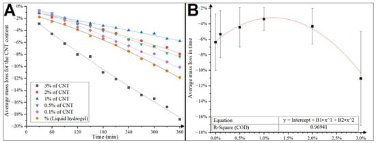 Comparison of the average mass loss of hybrid CNT hydrogels produced by homogenizing CNTs in acetone with polynomial regression (A). Average mass loss of hybrid CNT hydrogels in comparison to the SignaGel (B). Average mass decrease over time as a function of CNT content.