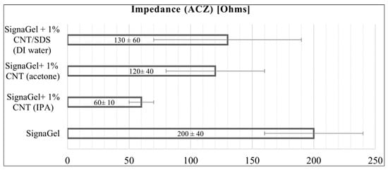 Due to the strong hydrophobicity of CNTs, the sonication of CNTs in water required using a surfactant [33]. A common CNT surfactant SDS was selected for testing. Samples were made the same way as for acetone and IPA; however, in the case of water as a solvent before sonication, 0.3 wt.% of SDS was added. For the samples homogenized in water (with SDS) containing 1 wt.% of CNTs, the average mass loss amounted to −5.3% ± 0.8% after 6 h, which was also not a statistically significant difference (8.4% difference) from the results obtained for homogenization in acetone. Again, no significant statistical difference concerning reference samples was found. Therefore, samples with 1 wt.% CNT were selected for electrical tests. In the case of water as a solvent, an average impedance decrease of 35%, compared to reference clear hydrogel, was obtained.