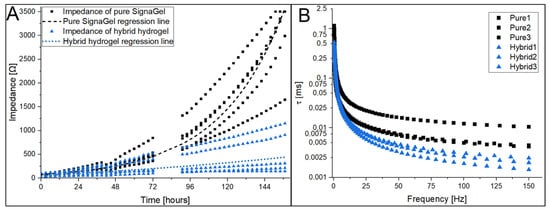 Results of (A) long-term impedance test of hydrogels and (B) time-constant parameter in frequency.