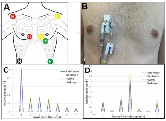 (A) Scheme of electrodes placement; (B) photo of one pair of hybrid hydrogels and reference electrodes; FFT analysis of recorded waveform of the C2 ECG signal, before (C) and after 72 h of recording (D), in absolute units.