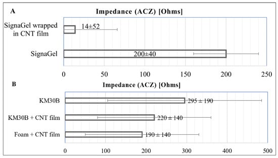 The pressure tests showed that the structure retains its integrity until the film’s continuity is breached due to high-pressure application (above 50 N). However, the visible impermeability of the CNT film may cause concerns about the moisturization of the epidermis and sweat penetration. Therefore, drying tests were also performed. The hybrid hydrogels were placed on electrodes, and similarly to the previous experiments, they adhered gel-to-gel, and their mass loss was tested. The result of the mass loss test was −8.0% ± 2.6%. This result is within the margin of error for the pure hydrogel. Depending on the initial parameters of the pure hydrogel samples, hybridization can either improve or maintain hydrogel drying levels. This shows that hybridization by wrapping in CNT film, as in the case of hybrid hydrogels obtained by mixing, can elongate its drying period and increase its stability. Also, mass loss tests show that because the molecular water from the hybrid hydrogel exchanges with the surroundings, the skin will be locally moisturized during the measurement, as for a standard liquid hydrogel. This may be explained by the nanoporous carbon structure of CNT assemblies. which was found before to adsorb molecular water [41]. Further, electrical tests of the wrapped hydrogels were performed using the gel-to-gel method (see also Supplementary Materials Table S6). The difference in the ACZ test is presented in Figure 7A.