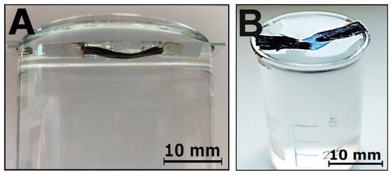 Further, the effect of the direct exposure of the CNT film to individual hydrogel components, liquid water and a water–salt mixture, was studied. CNT film fragments were immersed in pure DI water and in DI water with NaCl and KCl salt mixtures. As in the previous tests, in the first part of this experiment, a ribbon of a CNT film sample was adhered by its ends to the laboratory slides using silver paste. Then, the samples were placed on the containers with DI water mixtures with NaCl and KCl of 10% concentration so that the most significant possible part of the film was immersed without immersing the measuring contacts, as presented in Figure 8A. A series of test specimens was also left in the air. In the second part of the experiment, the pieces of the film adhered directly to the glass vessel at its edges to form a bridge immersed in the liquid to eliminate possible interference caused by covering the vessel with a glass plate in the first part of the experiment, as presented in Figure 8B. A series of test samples was also placed in pure DI. The resistivity of all the films was measured for 24 h; the average results are shown in Table 3.