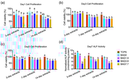 The effects of the 3-day, 7-day, and 14-day extracts of resin composites on the cell proliferation evaluated on (a) day 1, (b) day 3, (c) day 5, and (d) ALP activity on day 7, compared with the control group (no resin composites extracts) (different small letters indicate significant differences between BAG groups using extracts from the same day).
