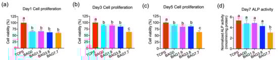 The MC3T3-E1 cell proliferation on experimental resin composites was evaluated on (a) day 1, (b) day 3, (c) day 5, and (d) ALP activity on day 7, compared with the TCPS group. (Different small letters indicate significant differences between BAG groups on the same-day cell culture).