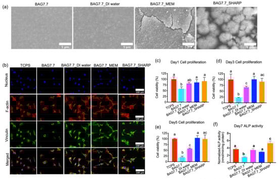 In vitro biocompatibility of biomimetic calcium phosphate layers on preconditioned resin composites. (a) SEM images of preconditioned composites, (b) immunofluorescent images of MC3T3-E1 cells after 6 h of culture. MC3T3-E1 cell proliferation on (c) day 1, (d) day 3, and (e) day 5. (f) MC3T3-E1 ALP expression on day 7. Different small letters indicate significant differences between BAG groups on the same day.