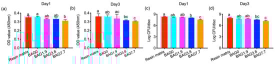 The cell viability was assessed by the XTT assay on (a) day 1 and (b) day 3, and CFU counts in bacteria biofilm on (c) day 1 and (d) day 3. Different small letters indicate significant differences between BAG groups on the same day.