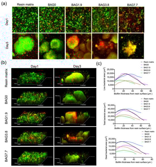 To explore the bacteria viability distribution throughout the depth of the biofilm, the 3-day-old biofilm was further analyzed because of its distinct discrepancy among BAG groups. Figure 5c depicts the total bacterial area, live bacterial area, and dead bacterial area in each layer of the 3-day-old biofilm vs. biofilm thickness for different BAG groups. The area under the curves and the peak positions of the curves are demonstrated in Table 1. All groups demonstrated an initial ascent, then a peak, followed by a drop in the bacterial areas. The resin matrix, BAG0, BAG1.9, and BAG3.8 possessed higher total bacterial volumes than BAG7.7 with a bacterial volume of 78 × 104 μm3. This phenomenon was also reflected in the live bacterial volume and dead bacterial volume. Furthermore, the peak position of the total bacterial curve was 20 μm for the resin matrix, BAG0, BAG1.9, and BAG3.8, while that of BAG7.7 was the smaller (16 μm). BAG7.7 also showed the smallest peak position value of 11 μm in the live bacteria curve.