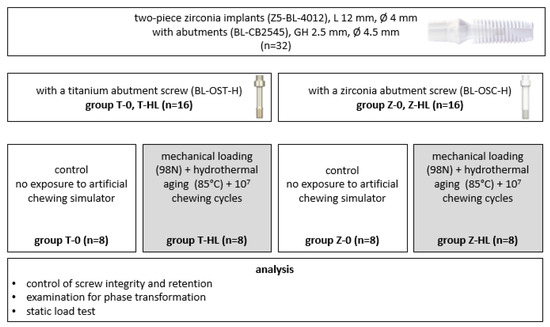 A total of thirty-two two-piece zirconia implants were incorporated in the study. For 16 implants, the zirconia abutments (BL-CB2545, Z-Systems) were connected with a titanium screw (BL-OST-H, Z-Systems) (group T, for titanium screw), and for 16 implants, the abutments were fixed with a zirconia screw (BL-OSC-H, Z-Systems) (group Z, for zirconia screw). Each group was subdivided into subgroups of eight implants depending on whether the implants were submitted to hydrothermal aging and mechanical loading (HL) in an artificial chewing simulator or not (0). Thus, four subgroups resulted: T-0, T-HL, Z-0, and Z-HL. One sample from each group was chosen at random, cross-sectioned, and examined for its crystal composition using scanning electron microscopy (SEM). Apart from these samples, all other specimens that endured the dynamic loading and aging were subjected to a quasi-static loading test using a universal testing machine until fracture occurred. The findings were then subjected to statistical analysis.
