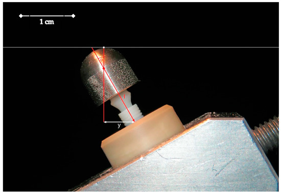 A sample (implant with screw-retained abutment plus loading hemisphere) embedded according to ISO standard 14801 in a PEEK tube (y = lever arm, 5.5 mm; I = distance from tube rim to the loading center, 11 mm; α = embedding angle, 30°).