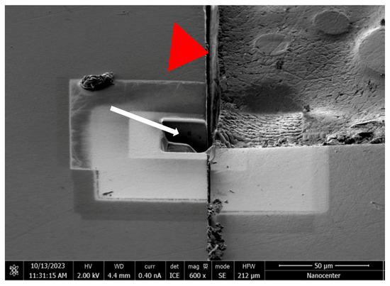 An ion-milled cross-section (white arrow) prepared by FIB in the implant head (red arrow head) of a loaded hydrothermally aged sample.