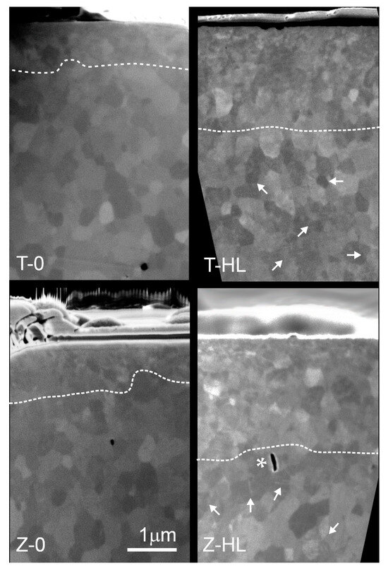 The subsurface regions of the implants without and with mechanical and hydrothermal loading were evaluated by FIB-SEM analysis (Figure 6). Without combined treatment, the implants revealed an approximately 1 μm thick transformation zone depth affecting ~2 grain columns with a refined, nanoscale intergranular domain microstructure. With mechanical load and hydrothermal aging, the transformed zone depth became larger, extending approximately 3 μm into the bulk. The transformed layer was coherent, i.e., exhibiting indistinct boundaries between affected and unaffected regions, without the presence of microcracks typical for low-temperature degradation (LTD). At even deeper regions, beyond 3 μm, distinct intragranular boundaries and twin-related monoclinic variants with lath-like geometry could be observed as a result of thermomechanical-induced transformation.